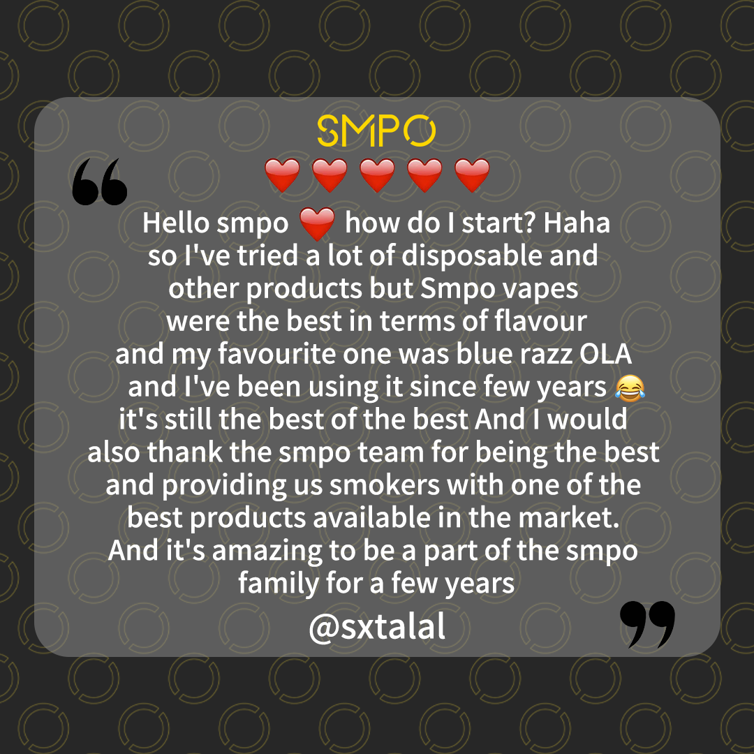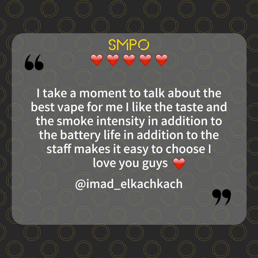 Imad is a great supporter who loves the taste and cloud intensity that SMPO provides. He values the long battery life and the helpful support from our staff, making his choice easy every time. His passion for the best vape experience is what keeps us connected.