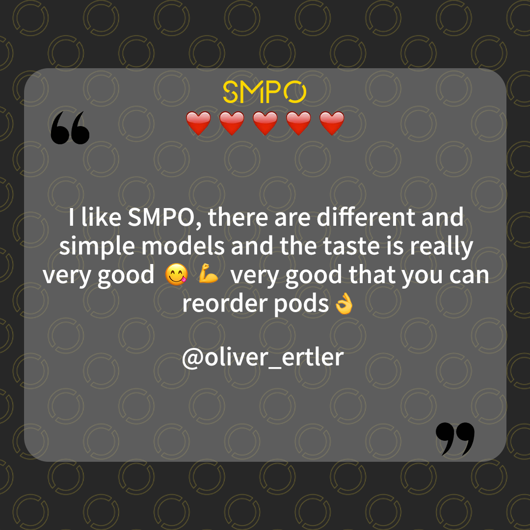 Oliver is a passionate SMPO fan who loves exploring its diverse yet simple models. For him, the exceptional taste and the convenience of reordering pods make it a perfect match. Living life to the fullest, Oliver and SMPO are the ultimate duo to go!
