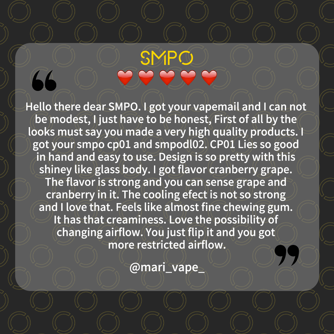 Mari is a dear friend who values the honesty and high quality that SMPO stands for. He provides fabulous insights into the design and functionality of devices like the CP01 and DL02, highlighting their "shiny like glass" beauty and creamy flavors.