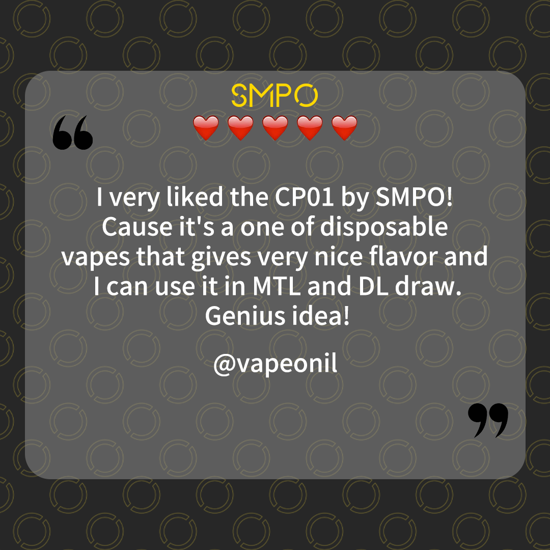 Vapeonil is a tech-savvy enthusiast who admires the "genius" design of SMPO. He values the rare combination of exceptional flavor with the flexibility of both MTL and DL draws. His passion for innovation makes him and SMPO a perfect match!
